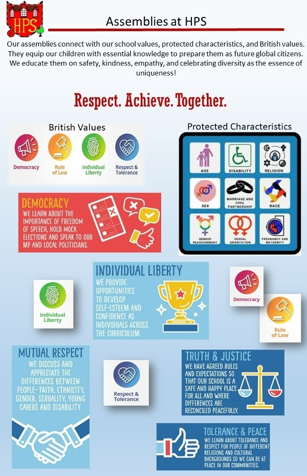 Our assemblies connect with our School Values, Protected Characteristics, and British Values. They equip our children with essential knowledge to prepare them as future global citizens. We educate our children on safety, kindness, empathy, and celebrating diversity as the essence of uniqueness!